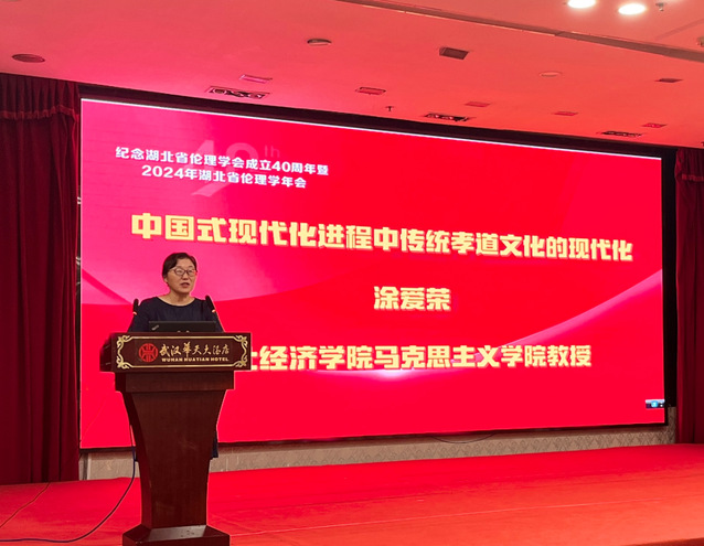 来自湖北省内各高校的代表围绕“中国式现代化的伦理问题”这一主题开展学术交流。涂爱荣教授在大会上作了题为“中国式现代化进程中传统孝道文化的现代化”的发言,她从传统孝道文化的精神内核、中国式现代化进程中传统孝道文化面临的挑战、传统孝道文化的现代转化三个方面与学者们进行了交流。她认为传统孝道文化的精神内核体现为孝养、孝敬、孝顺、孝谏、孝思五个层面的要求;中国式现代化进程中传统孝道文化面临的挑战,有观念层面的孝道意识淡漠化、行为层面的赡养行为物质化、技术层面的亲情联结网络化;对传统孝道文化进行现代转化,既要从观念层面实现由“父权至上”观念向民主平等观念的转化、由“养儿防老”观念向社会养老观念的转化、由家庭伦理观念向社会共同价值观念的转化,又要从行为层面实现由子女陪护向智能养老转化、由注重物质供奉向偏重精神慰藉转化、由身体赡养向知识赡养转化。她的发言引起了与会学者共鸣。