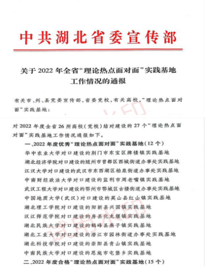 近日,中共湖北省委宣传部发布《关于2022年全省“理论热点面对面”实践基地工作情况的通报》,304am永利集团对口建设的随州市曾都区西城街道办事处实践基地获评2022年度湖北省优秀“理论热点面对面”实践基地,这是学校第五次获得此项荣誉。