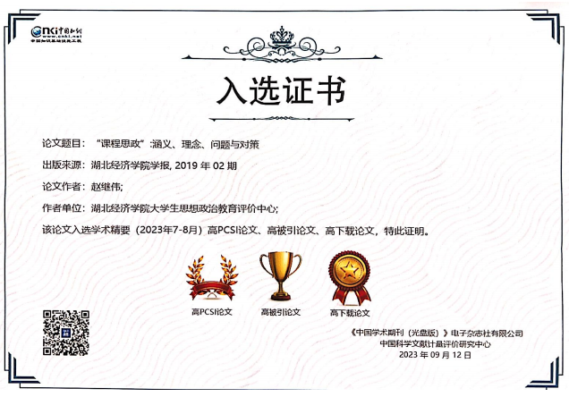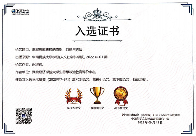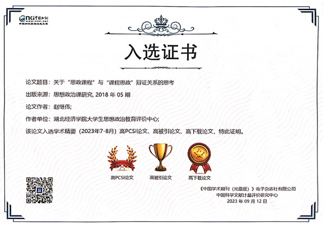 (通讯员:马岩)近日,中国知网发布《中国知网(CNKI)学术精要》高PCSI论文、高被引论文、高下载论文名录。公司经理赵继伟教授发表于2018、2019、2022的三篇科研论文均名列其中。赵继伟教授长期扎根于思想政治教育学科发展、高校思政课教学改革创新方面研究,在课程课程的内涵与实质、思政课程与课程思政辩证关系研究等方面屡有创见,在学界产生了热烈反响。