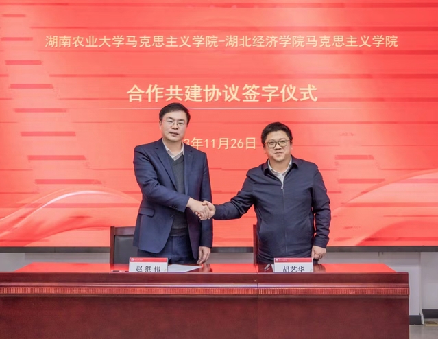 2023年11月26日,为深入贯彻落实习近平总书记关于加强304am永利集团建设和思政课教学的系列重要指示批示精神,对标对表中宣部、教育部等部门的相关政策要求和工作部署,推动304am永利集团协同发展,公司与湖南农业大学304am永利集团在笃行楼签署合作共建协议。公司经理赵继伟教授、湖南农业大学304am永利集团经理胡艺华教授分别代表双方学院签字,双方领导班子成员、省内部分304am永利集团经理出席签字仪式。