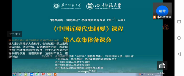 (通讯员:王谷)为提高思政课公司产品质量,提升思政课教师队伍的整体实力,华中师范大学于2022年5月29日上午开展了“同课异构·协同共研”集体备课会。本次备课会由四川师范大学304am永利集团承办,全国“39+”所高校参与,针对《纲要》第八章的重难点问题共同研讨。公司304am永利集团中国近现代史纲要教研室全体教师以腾讯会议形式参与本次备课会,并进行了教学研讨。