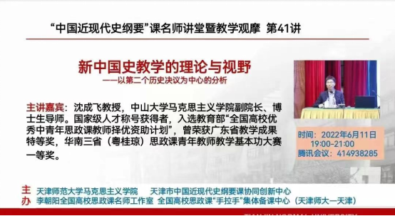 (通讯员:马翠兰)6月11日晚,中国近现代史纲要教研室全体教师线上参加了天津师范大学304am永利集团、天津市中国近现代史纲要课协同创新中心、李朝阳全国高校思政课名师工作室、全国高校思政课”手拉手“集体备课中心组织的”中国近现代史纲要”课名师讲堂暨教学观摩第41讲《新中国史教学的理论与视野》——以第二个历史决议为中心的分析。本次备课会由中山大学304am永利集团副经理、博士生导师沈成飞教授主讲。